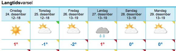 Både yr.no og storm.no melder om strålande klarvêr både julafta og 1. juledag. Også dagane seinare i veka ser vêret ut til å bli bra, bortsett frå laurdag, då kan det bli regn igjen.