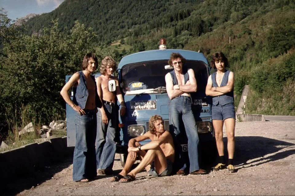 Musical Enterprise fotografert framfor orkesterbussen i stordomstida til orkesteret.