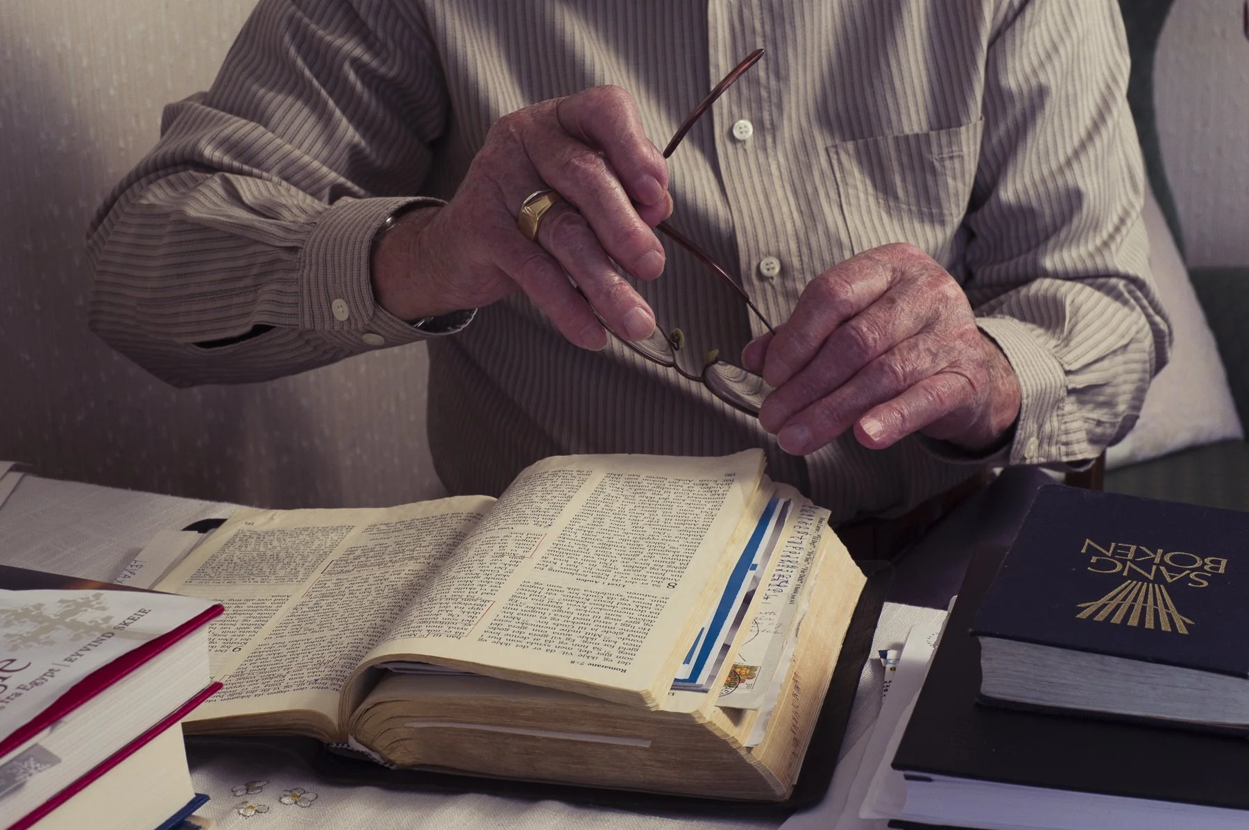 – Sjå her, har du lese dette? spør den gamle fiskaren og industriarbeidaren, og blar opp i Bibelen for oss. Han har funne noko i Johannes openberring som han tykkjer er fantastisk sagt: