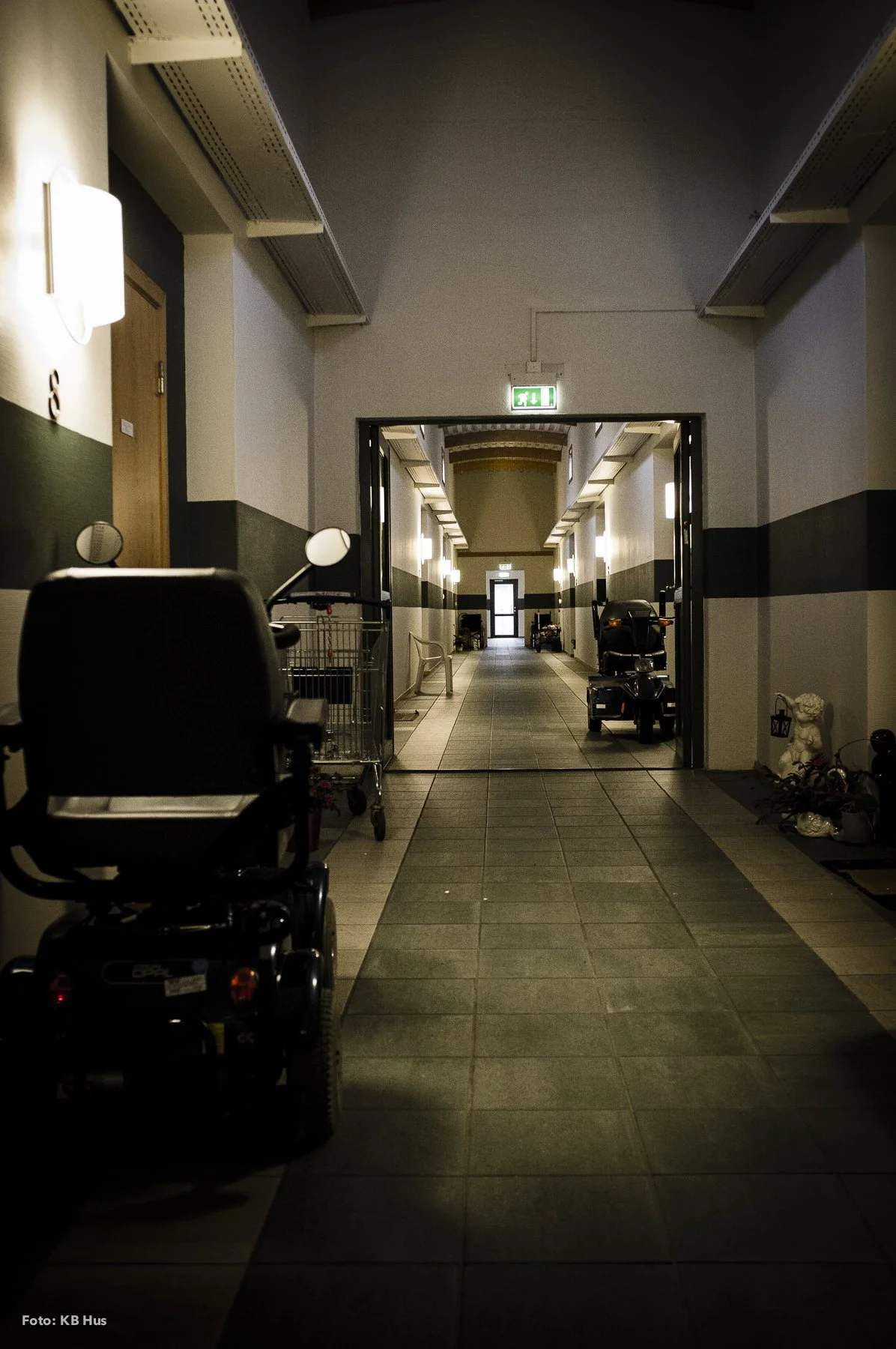 Rullatorar og batteridrivne køyrety i korridoren på Kvadraten fortel om at her bur mange eldre.
