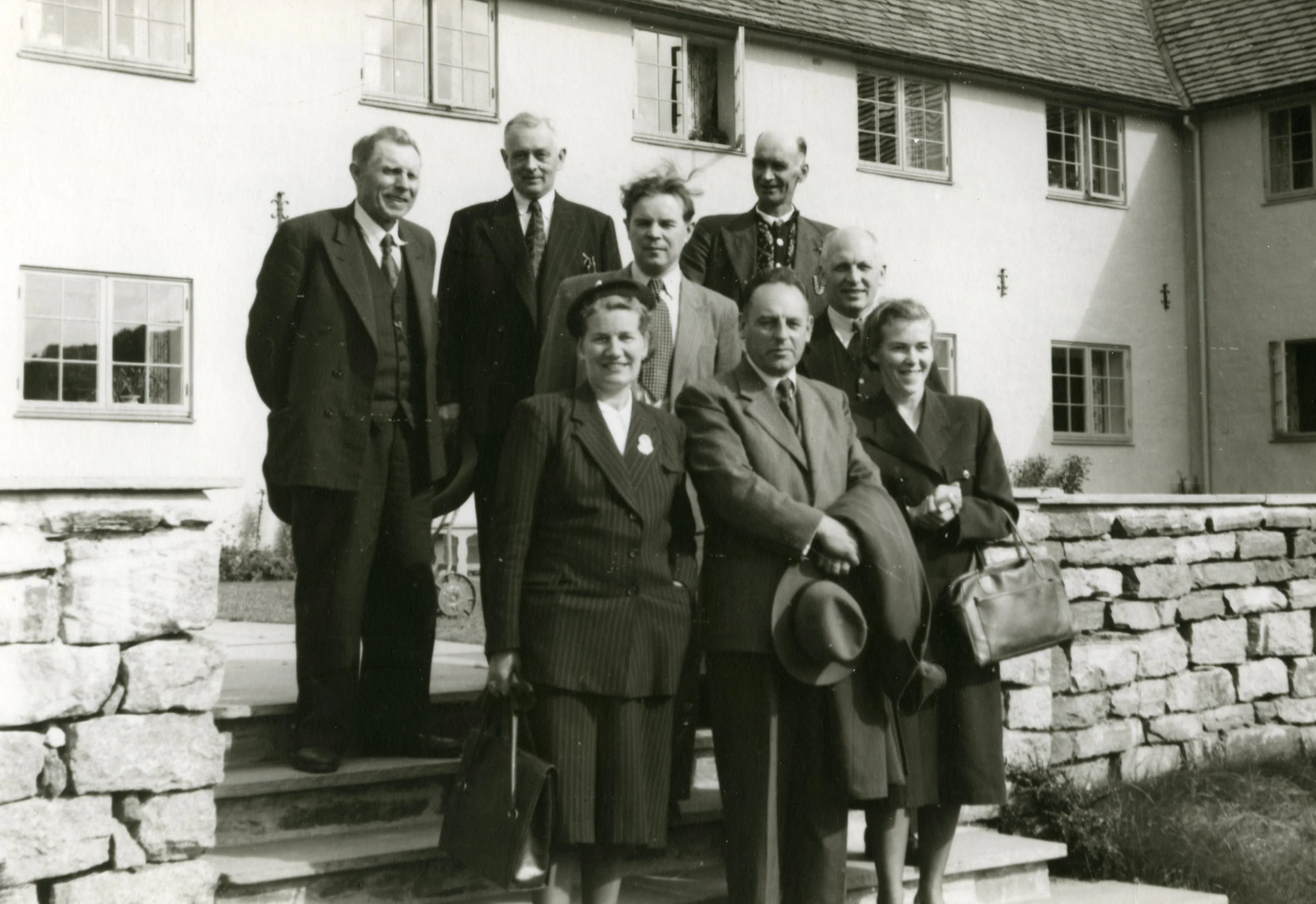 Byggjenemnda for Kvinnherad Aldersheim på tur til Fana (bak frå venstre): Gardbrukar Amund T. Myklebust, lensmann Sigurd Malmanger, gardbrukar Bernt Nes. I midten: Formann i nemnda, Gerhard Skaala og doktor Endre Haugen. Framme: Husmor Inger Holm, sokneprest Knut Sellevold og husmor Wenche Skaaluren. Aldersheimen stod ferdig i 1957. (Frå Kvinnherad kommune sitt digitale fotoarkiv).